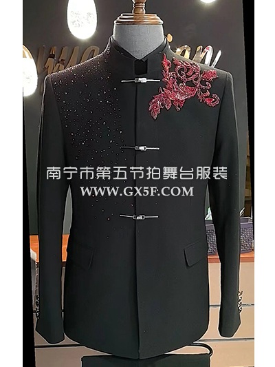 10B1021黑色烫钻红钉珠中山装套装主持人歌