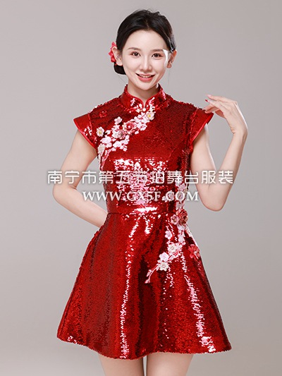 05G639红色细闪钉珠绣花新中式小礼服春晚
