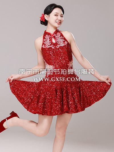 05G640红色亮片无袖钉珠绣花新中式小礼服