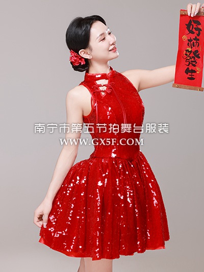 05G641红色无袖钉珠新中式小礼服春晚春意