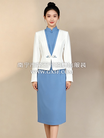 07G380白色中袖外套浅蓝无袖连衣裙职业装
