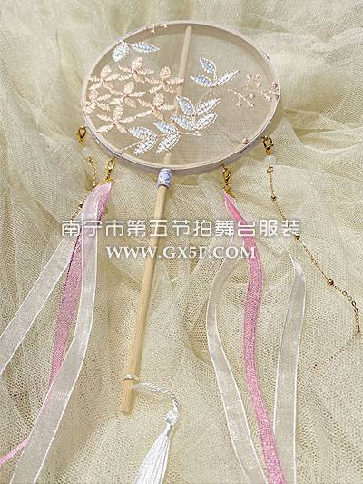 14G3110粉白纱古风长柄团扇绣花流苏汉服扇