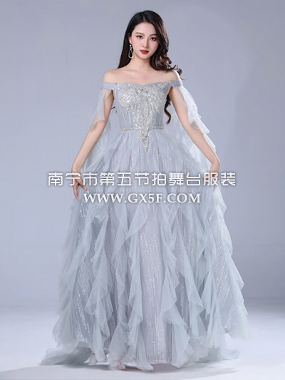 03G1366灰色亮片抹胸一字肩波浪裙摆长礼服