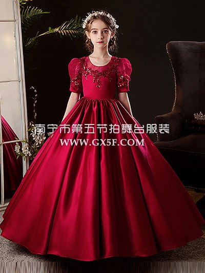 12G1721儿童女香槟红短袖长礼服公主裙
