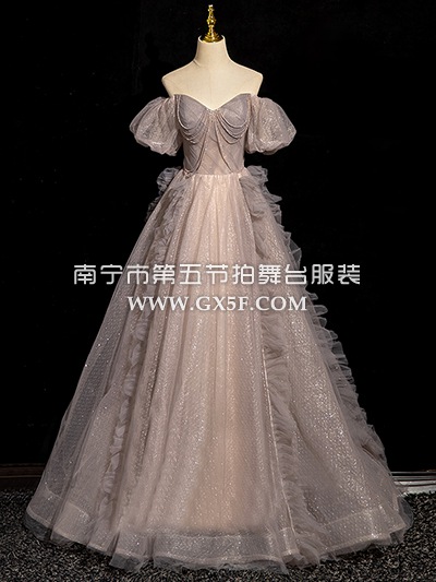 • 03G1292浅咖色抹胸一字肩短袖纱裙长礼服