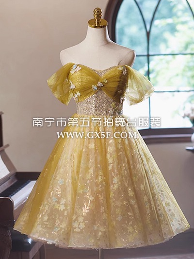 05G637黄色香槟色抹胸一字肩花朵森系短礼