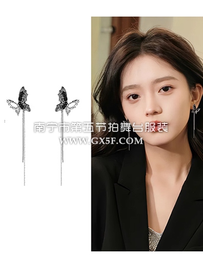 14G1336黑色蝴蝶流苏螺旋耳夹黑色长款耳环