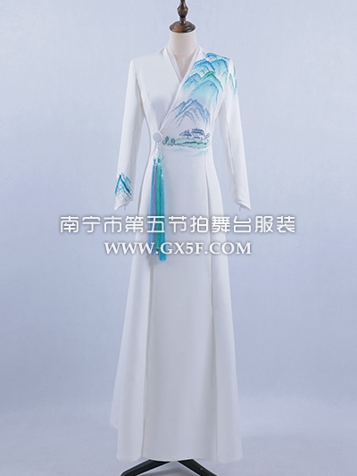 04G116白色长袖青山云岫连衣长裙主持朗诵