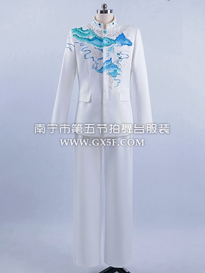 • 10B1019蓝绿山水云岫白色钉珠亮片中山装合