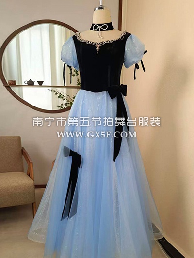 • 03G1369蓝黑圆领短袖蝴蝶结纱裙长礼服朗诵