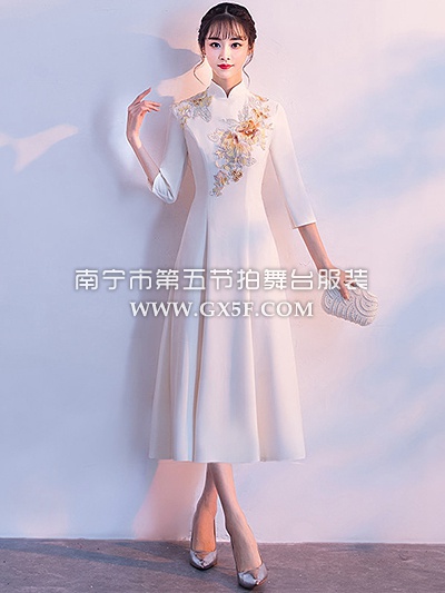 • 04G114白色中袖红刺绣印花中长礼服中式礼